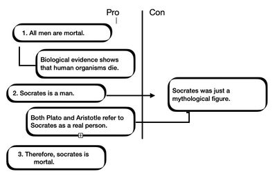 Just about everyone agrees with premise 2. A possible problem is whether or not Socrates lived. After all, he lived 2,500 years ago, and he never put anything in writing. The statement on the right side of the map is a detractor or an objection to the premise; the evidence is based on his students and others who wrote about him. Per the argument map, he could be a mythological character. The evidence for his life is much greater than he never lived. Do I have absolute proof; no, it is more plausible than he never existed.